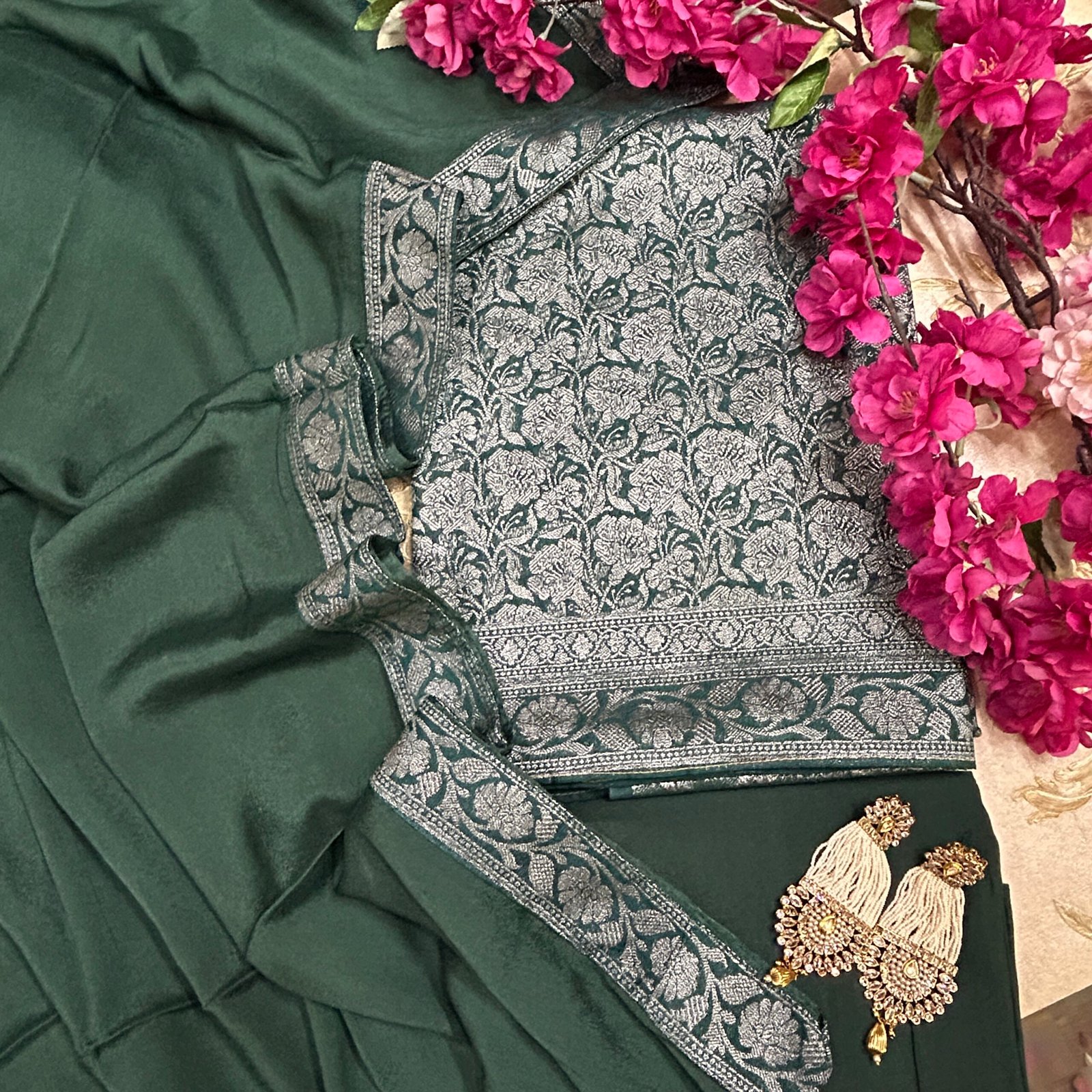 A timeless blend of tradition and elegance, this green brocade suit is crafted with intricate woven patterns that reflect rich craftsmanship. The lustrous fabric adds a regal charm, while the detailed motifs highlight the beauty of brocade work. Perfect for festive occasions, weddings, and cultural celebrations, this suit offers both comfort and grandeur. Pair it with delicate jewelry and classic heels for a complete ethnic look.
