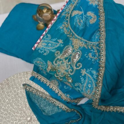 - Immerse in traditional charm with this soothing turquoise base, adorned with , highlighted with delicate floral patterns adds a graceful touch to the ensemble. Perfect for summer elegance and everyday ethnic style!